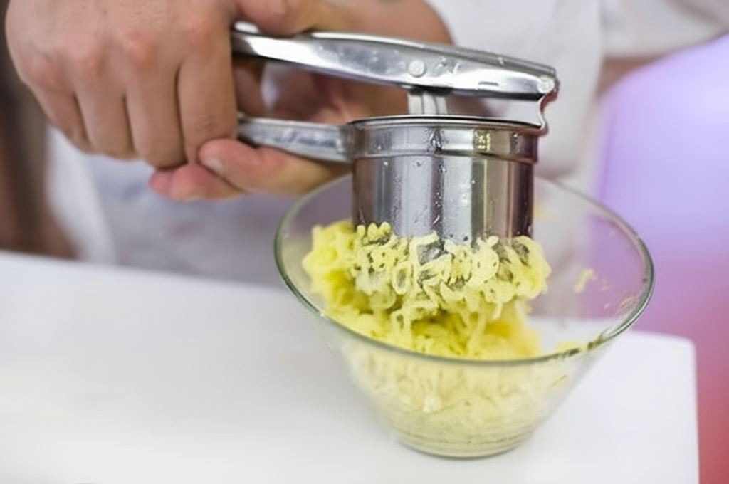 Ziemniaki opłucz i ugotuj w skórkach. Kiedy wystygną, obierz je i przepuść przez praskę.