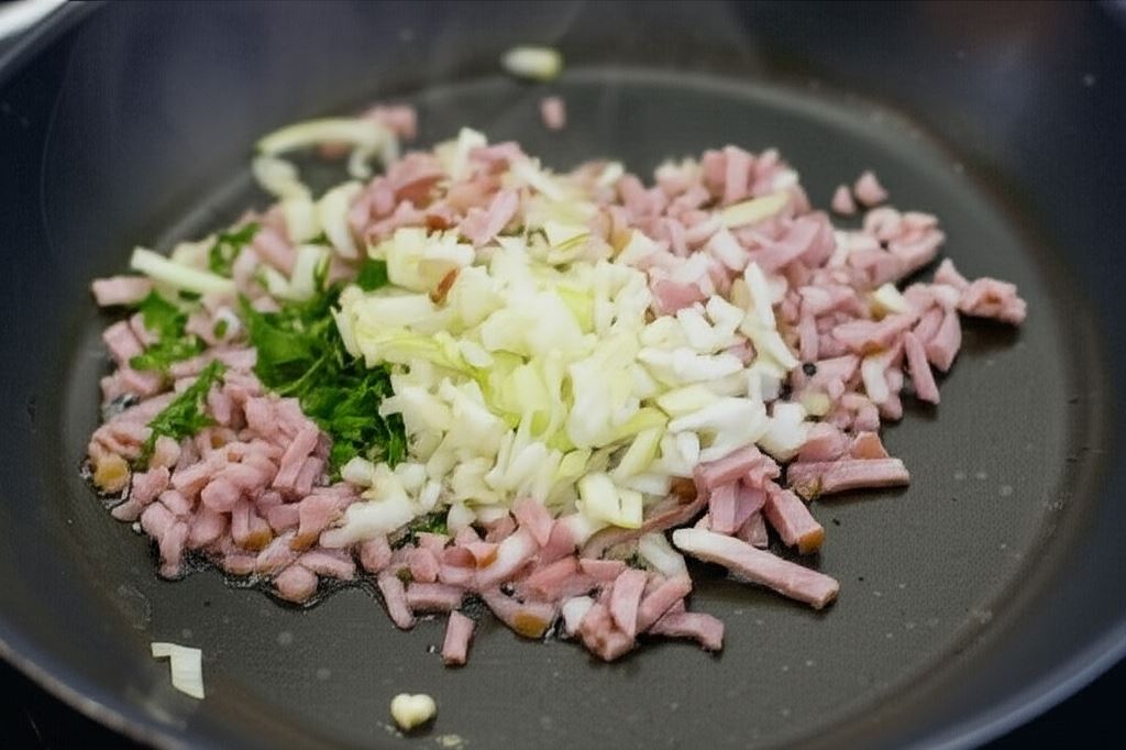 Sporządź farsz - szynkę i cebulę pokrój w kosteczkę, czosnek i natkę posiekaj drobno. Całość razem podsmaż na rozgrzanej oliwie.