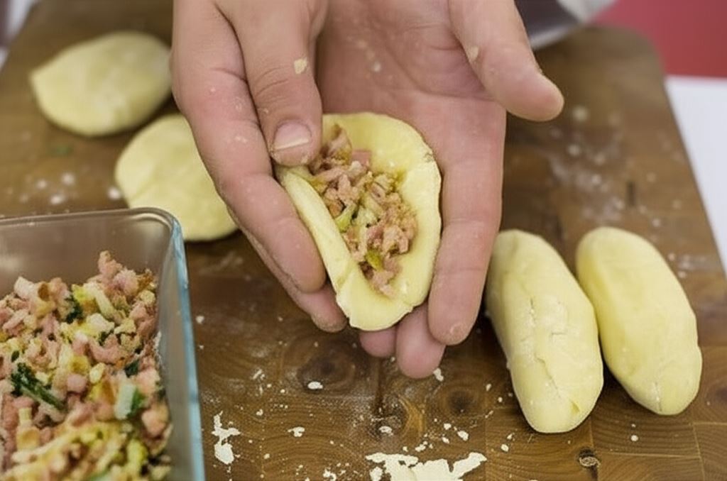 Uformuj z ciasta podłużne knedle, zrób wgłębienie na środku każdego, umieść w nim farsz i zlep ponownie. Gotuj około 10 minut w osolonej wrzącej wodzie.