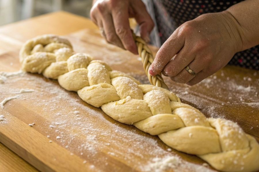 Kluczowy trik: Utrzymuj stałe, delikatne naprężenie podczas zaplatania – zbyt mocne ściśnięcie zdeformuje chałkę, zbyt luźne spowoduje nierówności podczas wypieku.