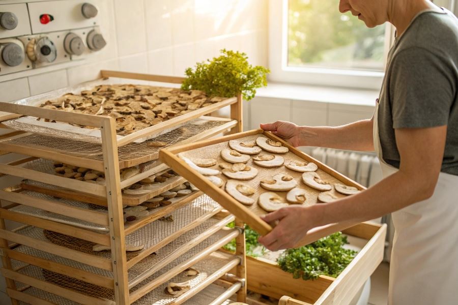 Suszenie na powietrzu wymaga stabilnych warunków atmosferycznych – temperatury powyżej 20°C, niskiej wilgotności i dobrej cyrkulacji powietrza. Najlepsze efekty osiąga się w przewiewnych, zacienionych miejscach, chroniących grzyby przed bezpośrednim działaniem promieni słonecznych. W optymalnych warunkach proces trwa 3-5 dni.