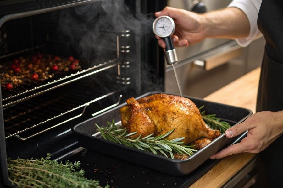 Sprawdzenie gotowości wykonaj wbijając termometr kuchenny w najgrubszą część uda – temperatura powinna wynosić 75°C. Alternatywnie, nakłuj mięso – wypływający sok powinien być przezroczysty, nie różowy.