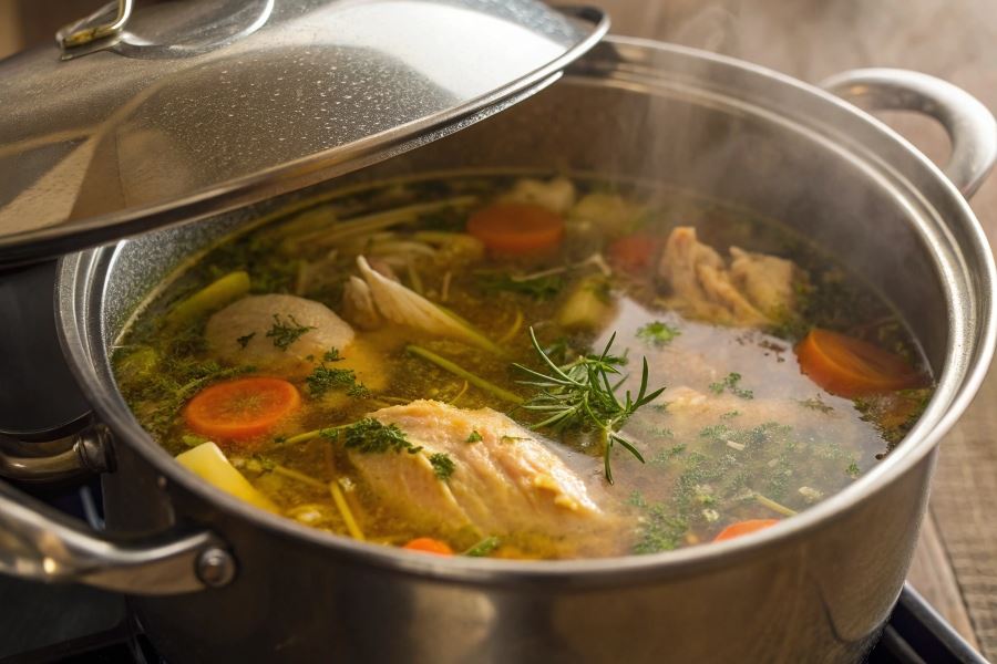Profesjonalna wskazówka: Podczas gotowania rosołu drobiowego pod przykryciem wystarczy pozostawić niewielką szczelinę, aby umożliwić delikatne odparowanie przy jednoczesnym zachowaniu większości aromatów.