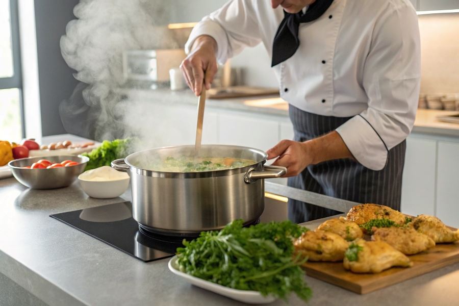 Podstawą wyjątkowej zupy krem z kurczaka jest bogaty w smak wywar. Najlepsze rezultaty osiąga się stosując metodę powolnego gotowania na małym ogniu przez minimum 60 minut. Profesjonalni szefowie kuchni rekomendują wykorzystanie całego kurczaka z kością, włączając skrzydełka i grzbiet, które uwalniają kolagen nadający wywarowi głębię i aksamitność.