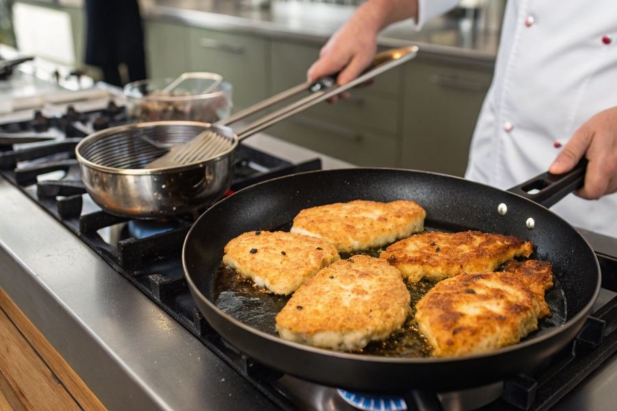 - Rozgrzej patelnię do temperatury 170-180°C (sprawdź gotowość wrzucając okruszek bułki tartej – powinien skwierczeć)
