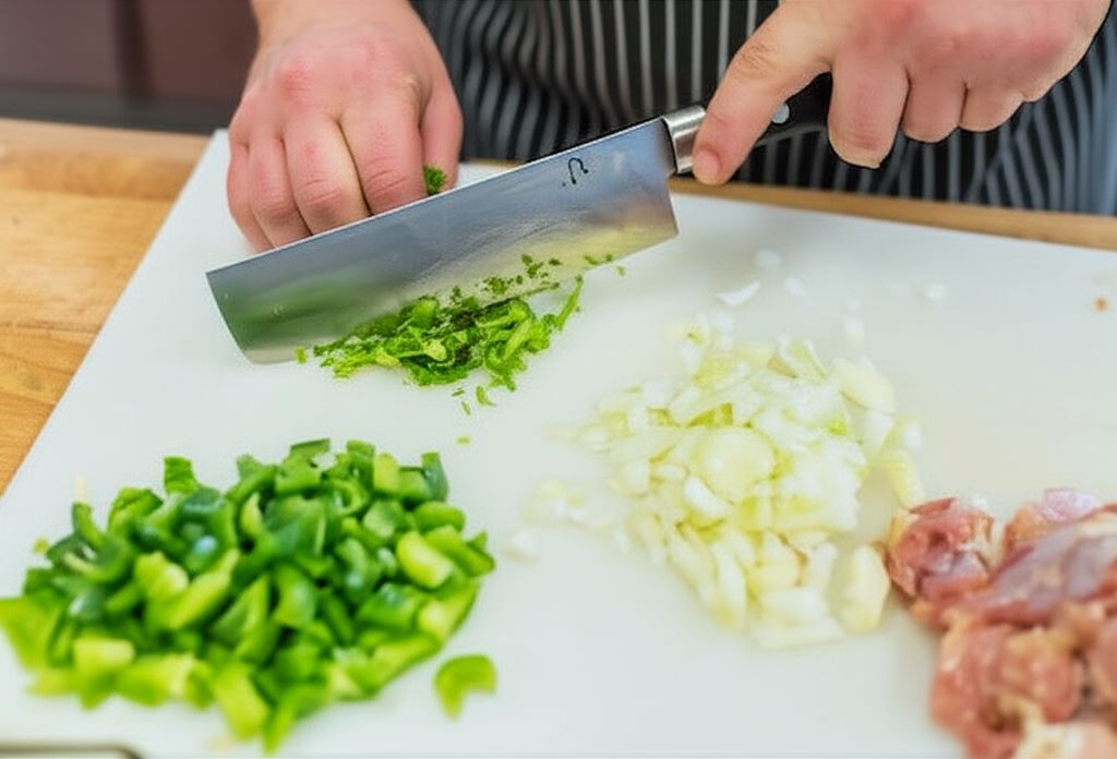 Oczyszczony imbir zblenduj na masę z czosnkiem i oliwą. Kurczaka pozbaw skóry, potem podziel na mniejsze części. Cebule posiekaj w drobną kostkę, paprykę zaś w nieco większą. Kolendrę drobno posiekaj.