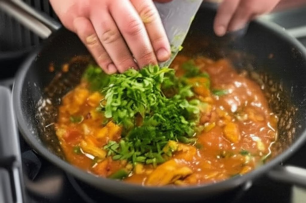 Na zakończenie wsyp posiekaną świeżą kolendrę, zamieszaj i serwuj.