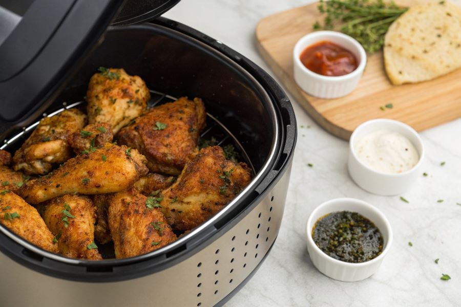 Przed umieszczeniem w frytkownicy skrzydełka powinny osiągnąć temperaturę pokojową. Kosz frytkownicy należy delikatnie spryskać olejem w sprayu lub wyłożyć papierem do pieczenia z otworami. Skrzydełka układamy w jednej warstwie, pozostawiając przestrzeń między nimi, co zapewni równomierne krążenie gorącego powietrza.