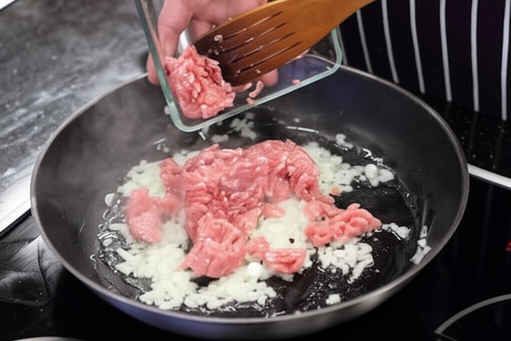 Rozpocznij przygotowanie chili con carne w pomidorach od podgrzania 2 łyżek oleju na patelni. W międzyczasie posiekaj cebulę w kostkę, wrzuć ją na patelnię i smaż na średnim ogniu, dopóki nie stanie się półprzezroczysta. Następnie dodaj na patelnię 300 gramów mielonego mięsa wieprzowo-wołowego. W trakcie smażenia mieszaj je, by nie utworzyło grudek.