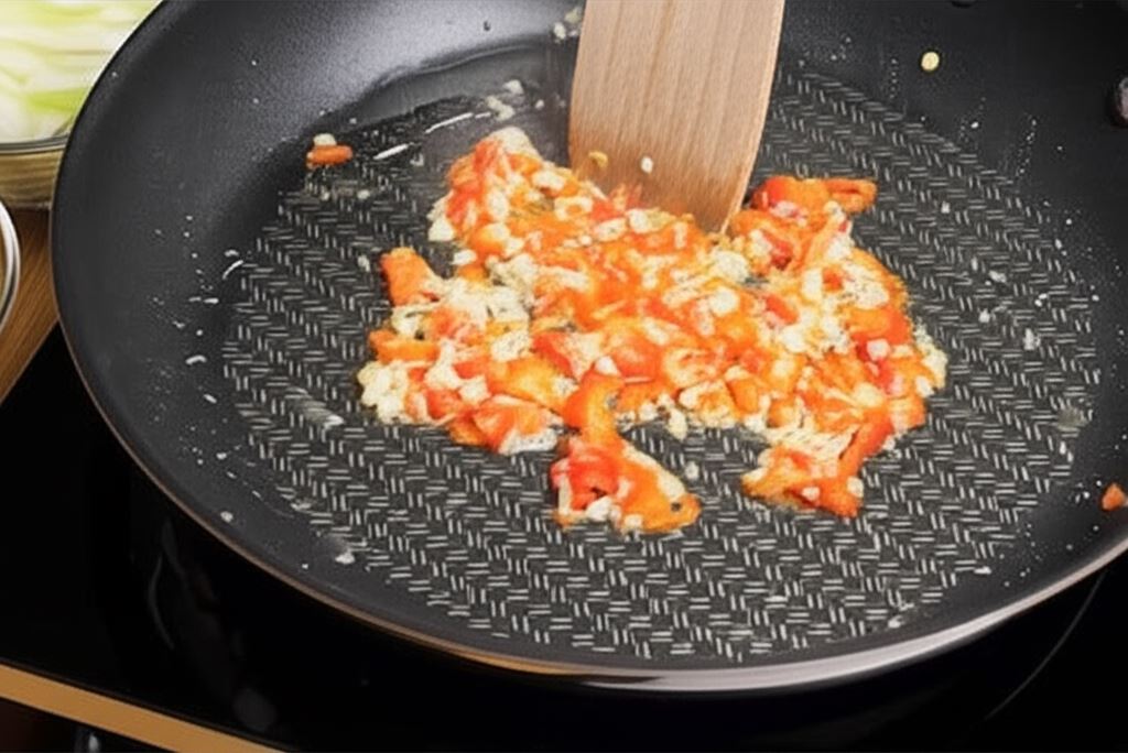 Przygotuj głębszą patelnię. Na małej ilości mocno rozgrzanego oleju zrumień czosnek, chili, cebulę i paprykę, pilnując, by składniki się nie przypaliły, gdyż wtedy danie zyska nieprzyjemnie gorzki posmak.