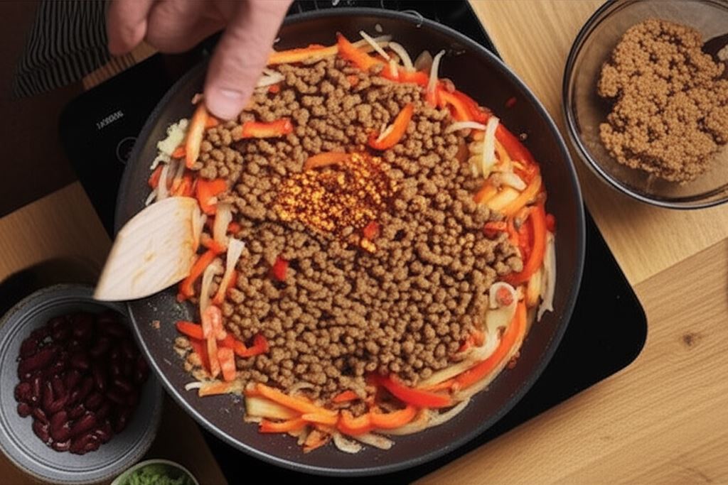 Kiedy warzywa będą już delikatnie podsmażone wsyp roślinne mięso mielone, fasolę i posiekaną kolendrę. Wszystko przypraw przyprawą Knorr, solą i pieprzem. Potrawę smaż około 5 min, mieszając co jakiś czas.