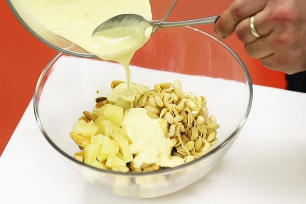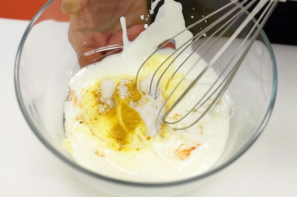 Składniki sosu (jogurt, majonez, sok z cytryny, curry, tabasco i cukier) dokładnie połącz i schowaj do lodówki.