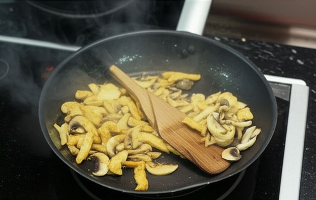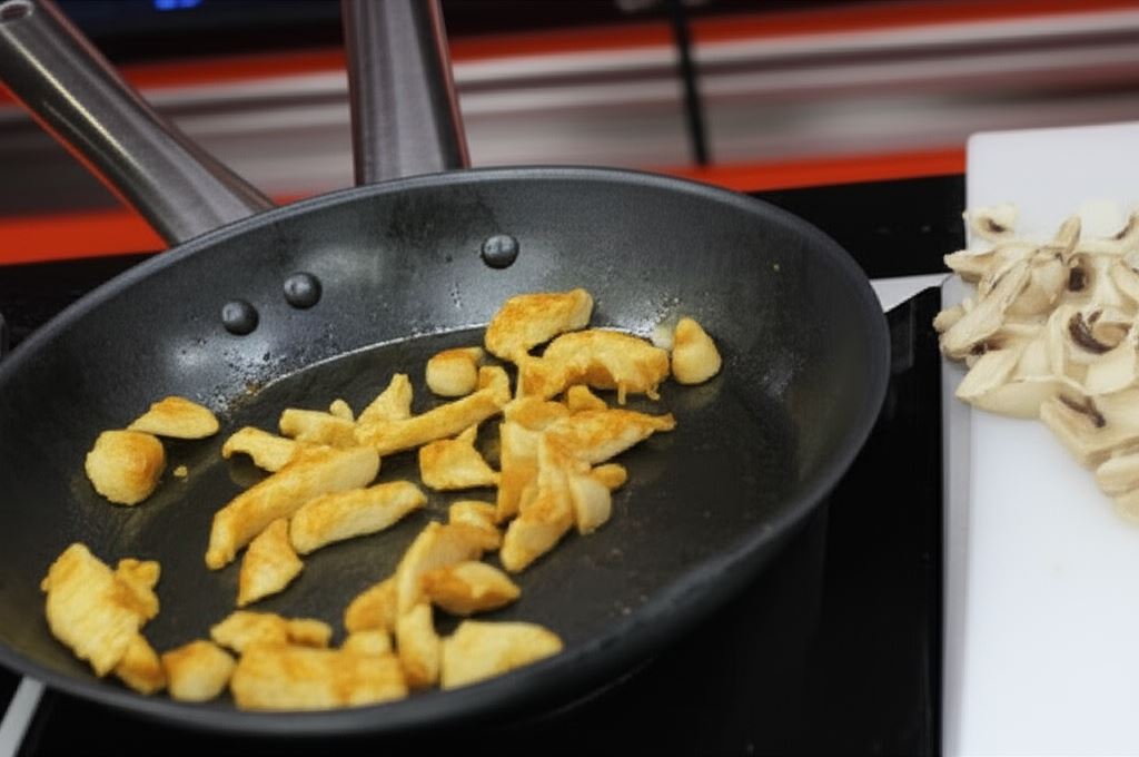 Potem podsmażaj mięso na patelni. W międzyczasie ananasa pokrój w kostkę, a pieczarki w plasterki.