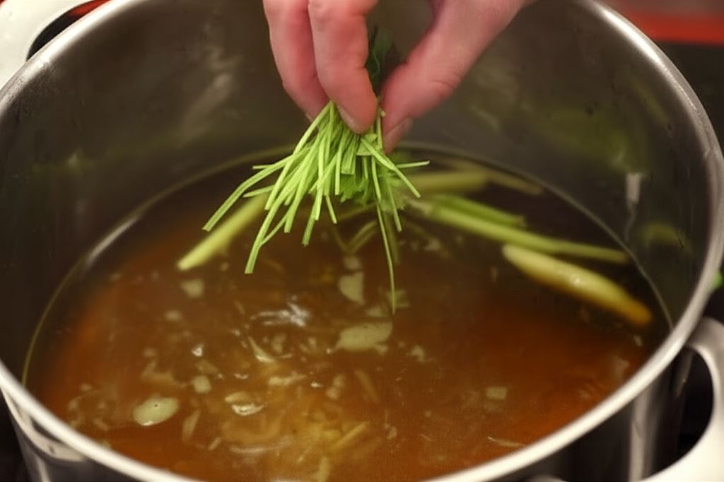 Wrzuć spore kawałki trawy cytrynowej, pół sosu sojowego, cukier, utarte kłącze imbiru, łodygi kolendry, sok z cytryny i gotuj intensywny bulion przez około 15 minut.