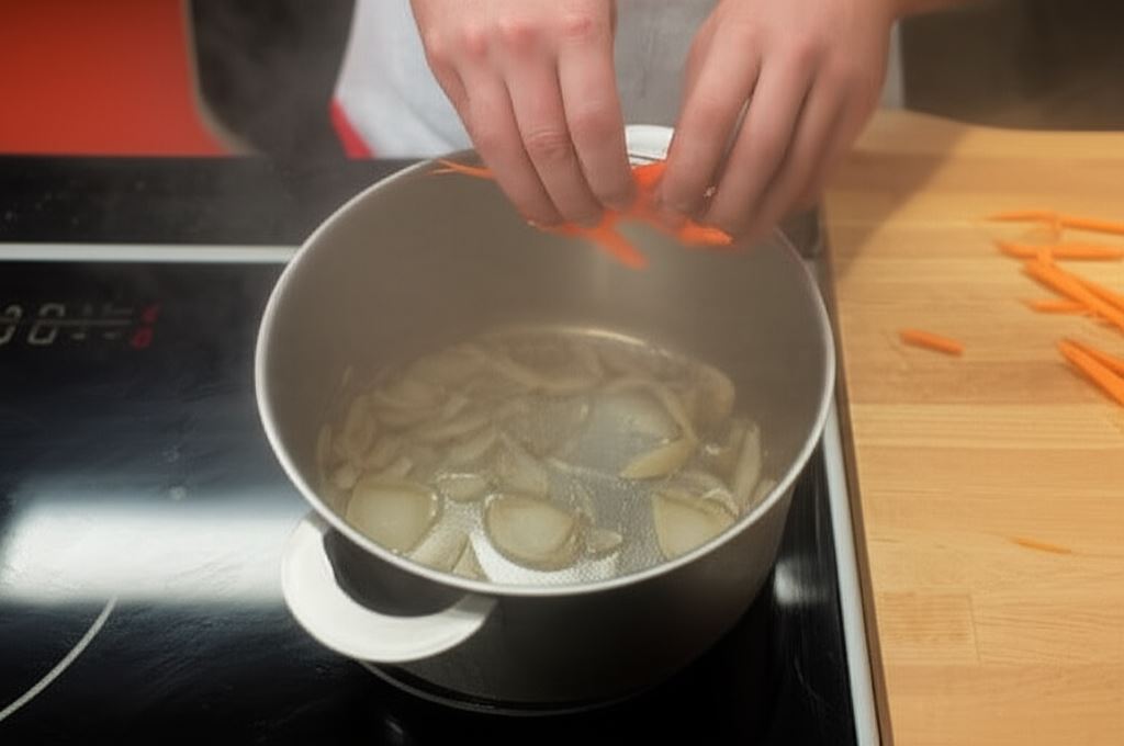 Wrzuć marchew pokrojoną w paski i smaż przez 3-4 minuty.