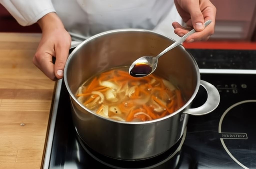Zalej wszystko 0.8 l wody, wsyp sos sojowy, starty imbir i gotuj około 10 minut.