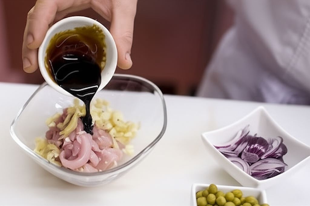 Potnij kurczaka na małe paski, potem dodaj sos sojowy, wsyp posiekany imbir i czosnek. Odstaw na 30 minut.
