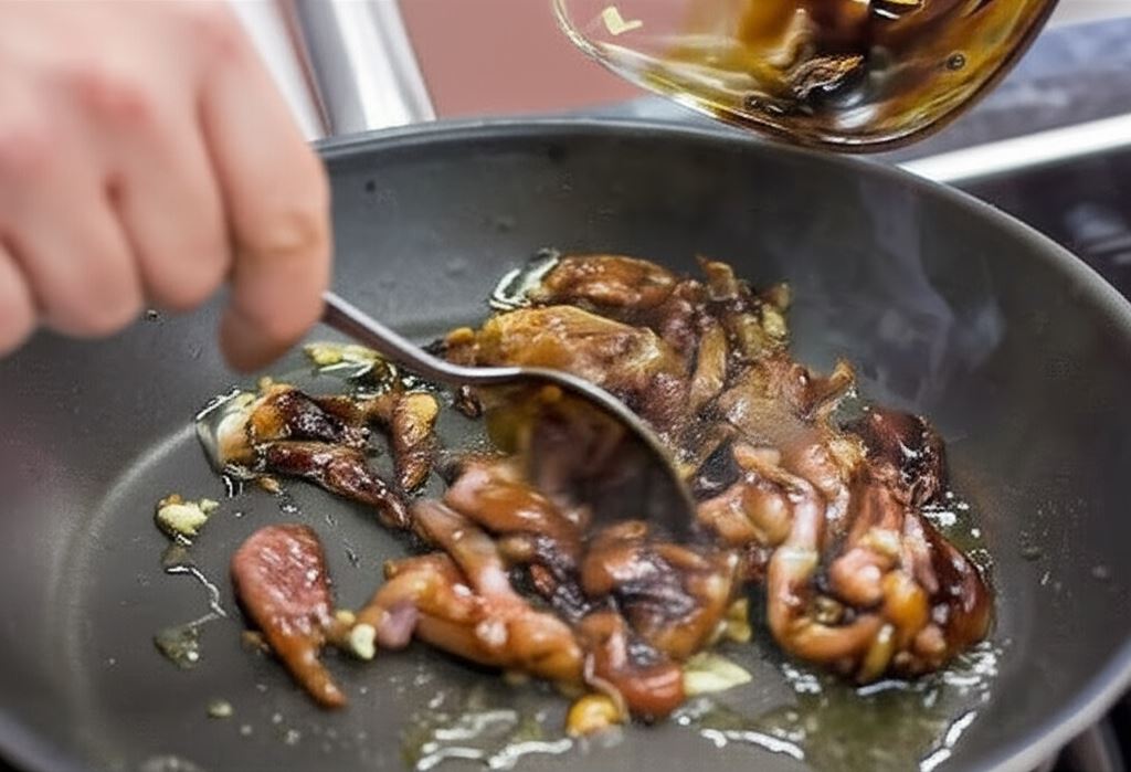Mięso razem z marynatą umieść na bardzo mocno rozgrzanym tłuszczu.