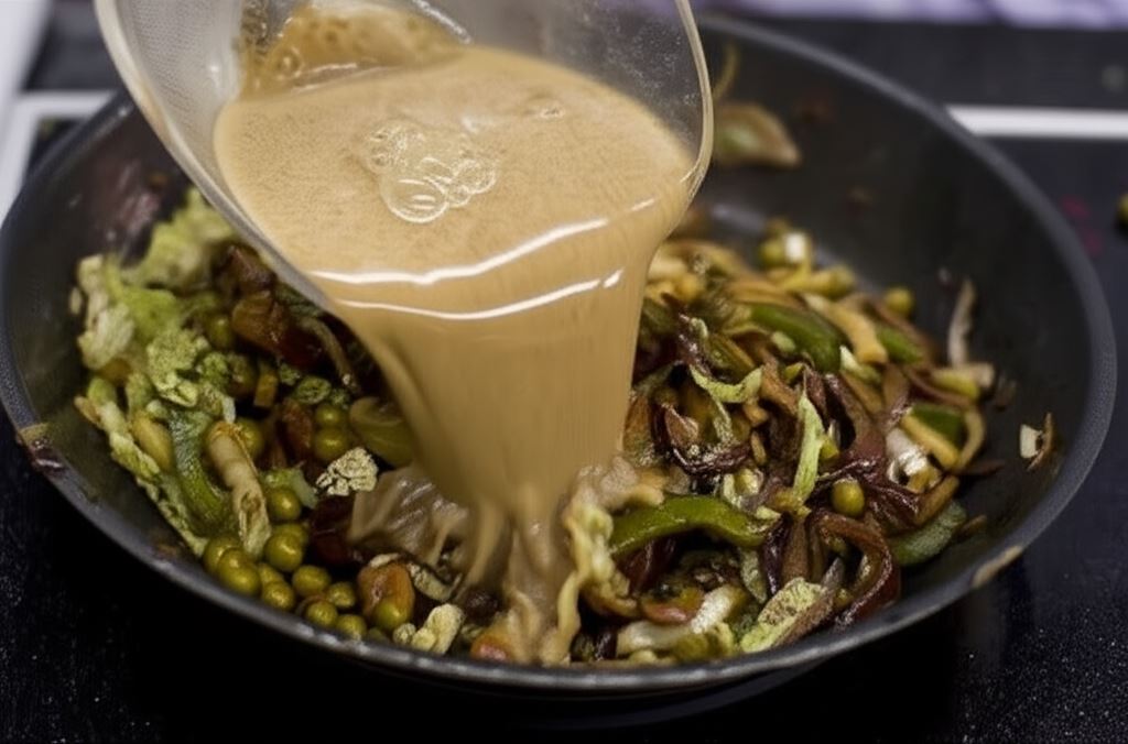 Po paru minutach smażenia, gdy mięso się zrumieni dodaj warzywa i kontynuuj smażenie wszystkiego.
