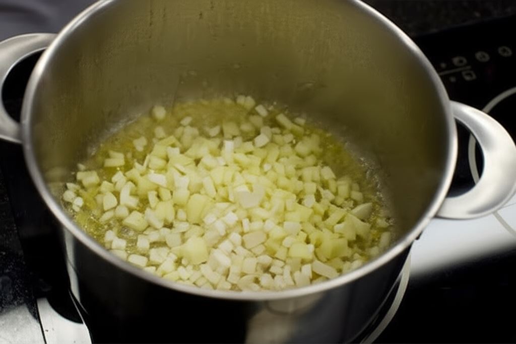 Cebulę zrumień w garnku na margarynie. Wsyp seler i jabłka. Smaż 10 minut – aż do momentu, kiedy jabłka zaczną się rozpadać a seler będzie miękki.
