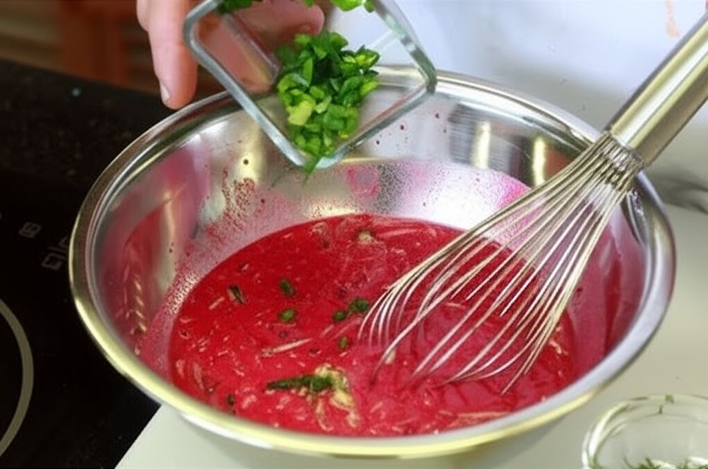 Saszetkę czerwonego barszczu Knorr wymieszaj w zimnej wodzie. Posiekaj botwinkę i wrzuć ją do barszczu. Całość doprowadź do wrzenia.
