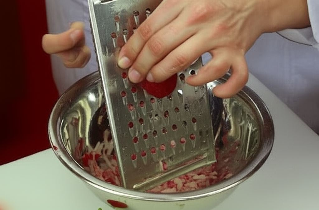 Zetrzyj rzodkiewkę i ogórka na tarce z dużymi oczkami. Wrzuć do zupy i zamieszaj. Chłodnik przypraw do smaku musztardą, solą, pieprzem i cukrem.