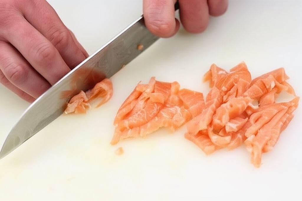 Ugotuj jajka na twardo i ostudź. Wyciągnij z kawałka łososia ości i potnij go w paski.