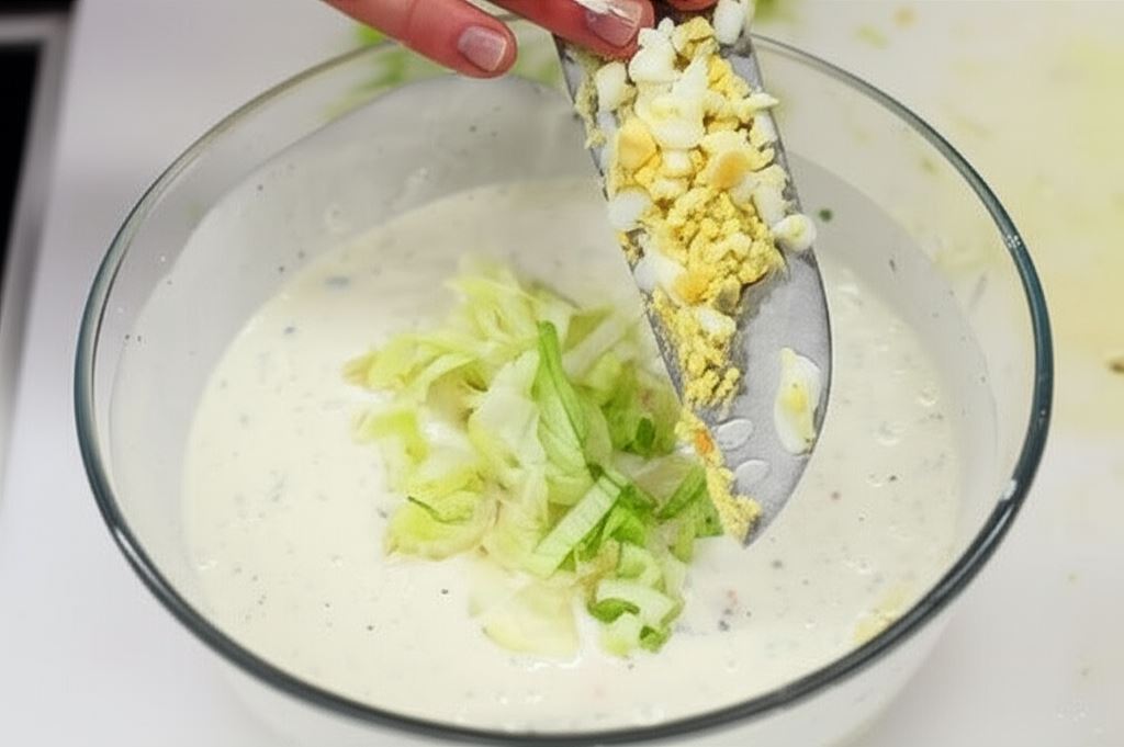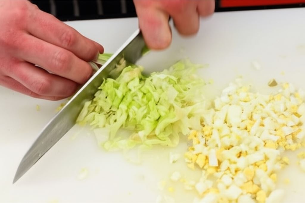 Potem posiekaj jajko. Sałatę potnij w paski, a kiełki rozdrobnij.