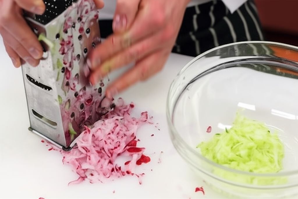 Oczyść i umyj ogórki oraz rzodkiewki, potem zetrzyj na tarce. Następnie wrzuć do barszczu.