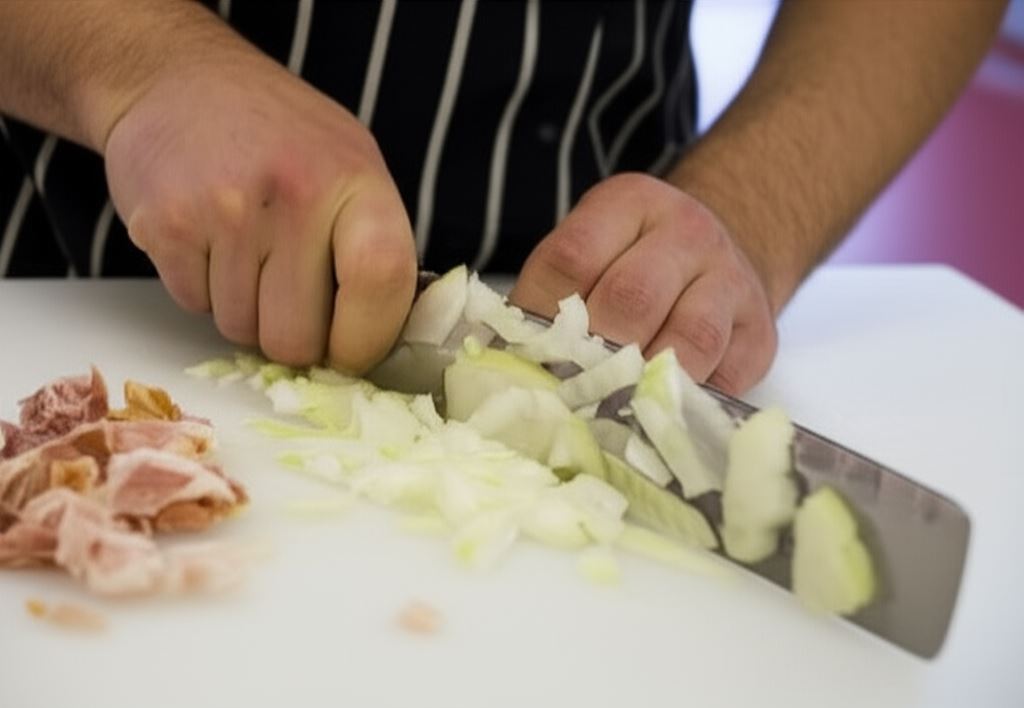 Boczek i cebulę pokrój w kosteczkę. Ser zetrzyj na tarce.
