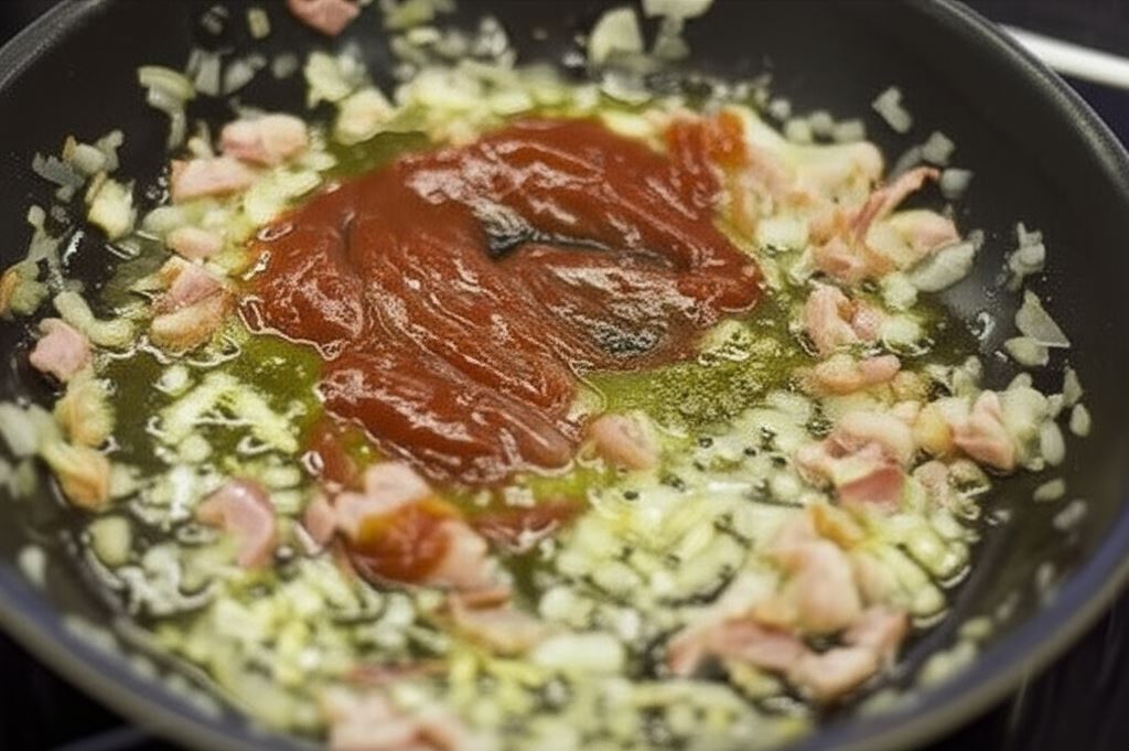 Na rozgrzanej oliwie zeszklij cebulę, dorzuć boczek i smaż wspólnie. Dodaj margarynę oraz ketchup i zamieszaj.