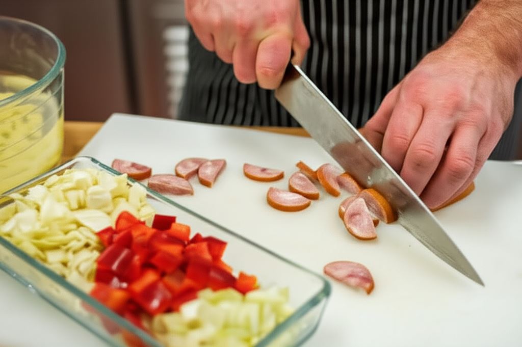 Posiekaj paprykę, kapustę, cebulę i ziemniaki w kostkę. Kiełbasę potnij w półplasterki.