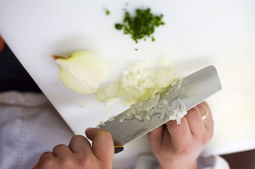 Natkę pietruszki płuczemy i siekamy drobniutko. Cebule obieramy i kroimy w najdrobniejszą możliwą kostkę.