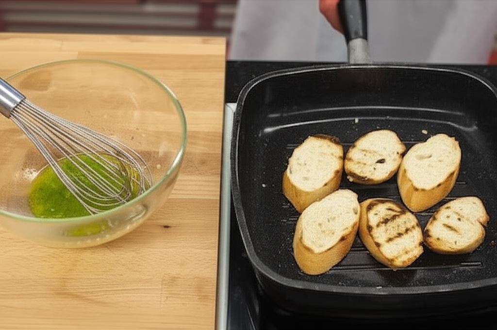 Bagietkę pokrój ukośnie na kromki o grubości 1,5-2 cm, a potem grilluj z obu stron aż na pieczywie pojawią się paski. Sos sałatkowy Knorr wymieszaj z oliwą oraz 3 łyżkami wody.