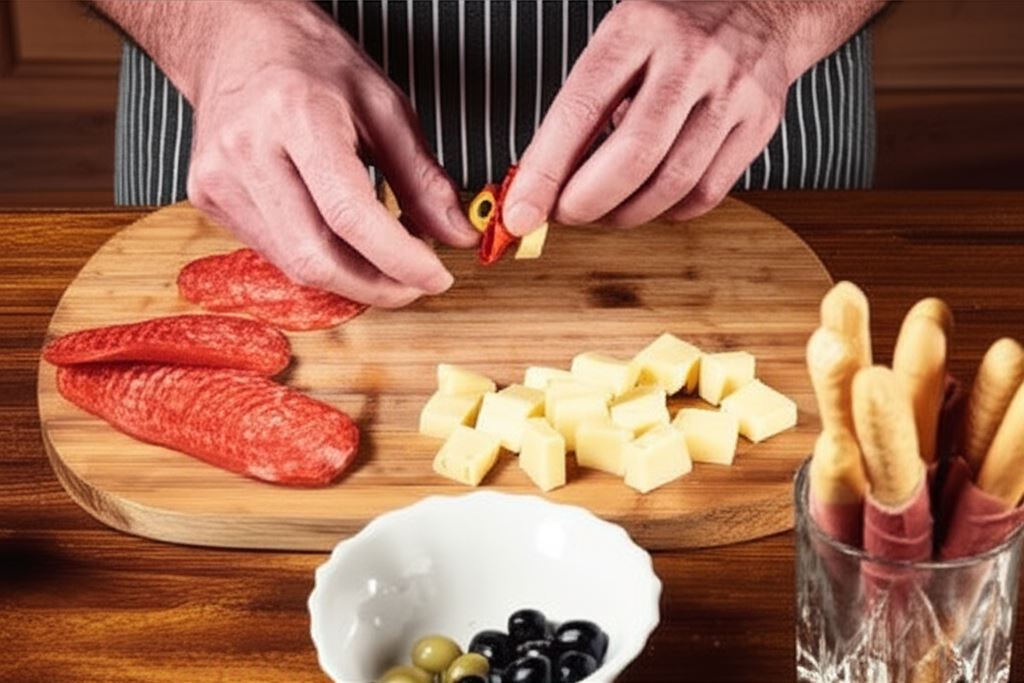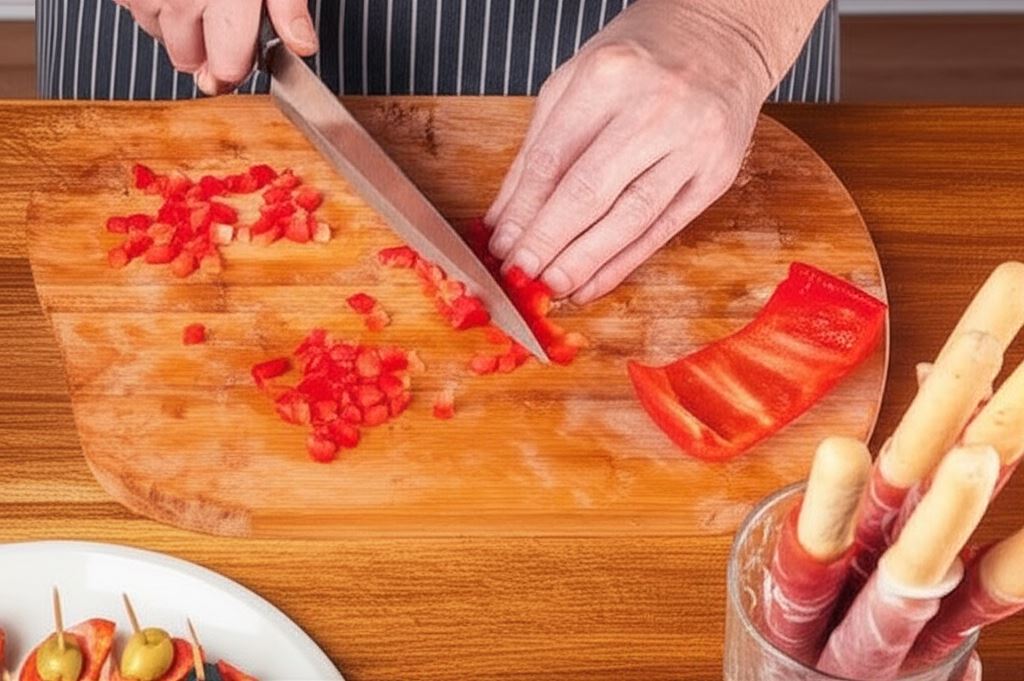 Chrupiące paluszki grissini owinięte cienkimi plastrami szynki parmeńskiej to doskonała propozycja na spotkanie towarzyskie. Ustawione w szklankach tworzą efektowną przekąskę, która zachwyci każdego gościa. Dopełnieniem są kolorowe koreczki z oliwek, salami i sera żółtego, które dodają całości charakteru.