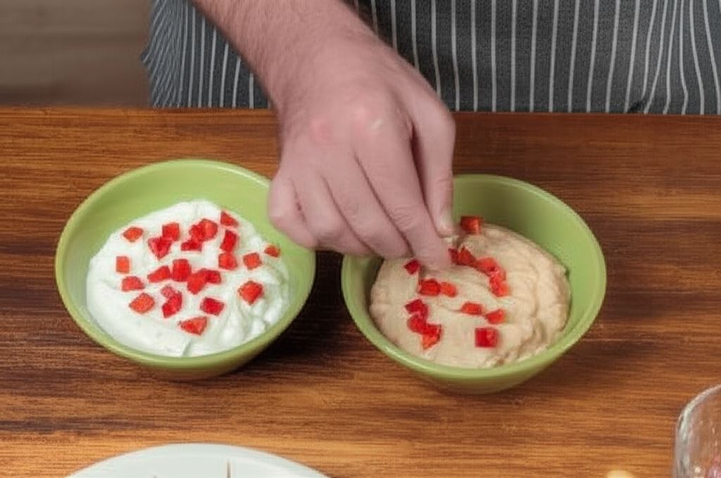 Umieść w drugiej miseczce i oba przygotowane dipy udekoruj drobniutką kostką z papryki i ziołami. Serwuj wraz z chrupiącymi paluszkami grissini i koreczkami.