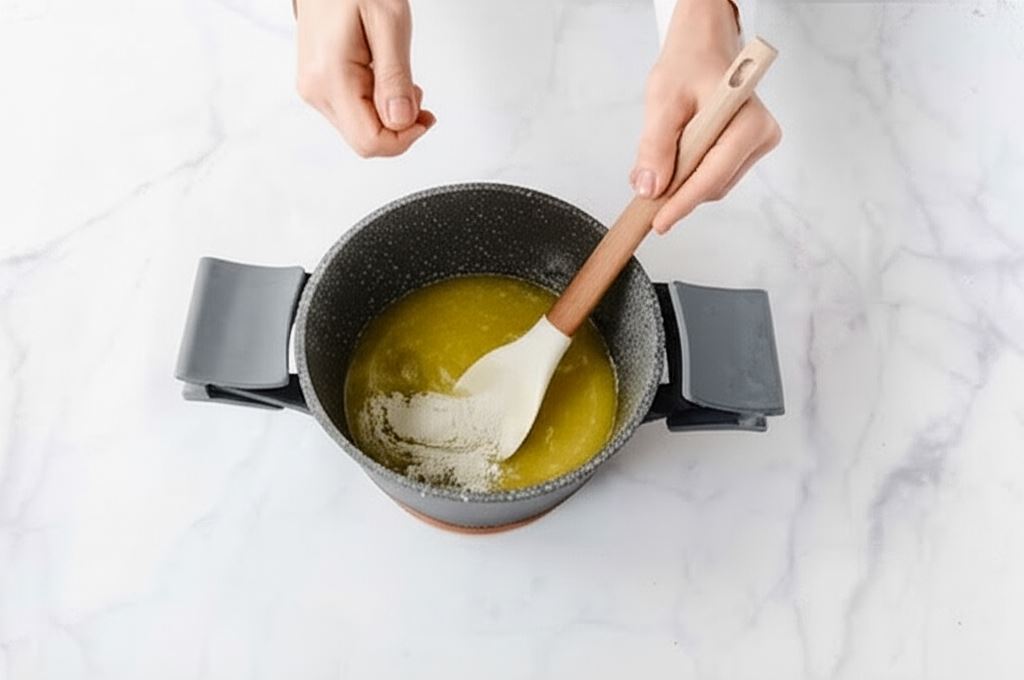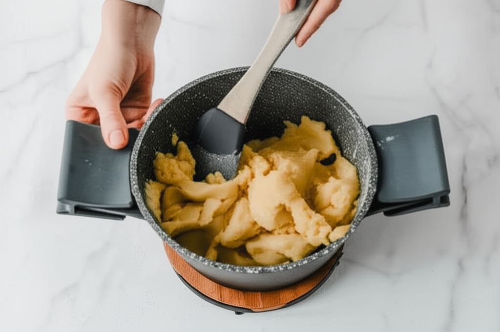 W garnuszku z wodą roztop naturalne masło. Do ciepłej wody wsyp mąkę pszenną i bardzo starannie wymieszaj wszystkie składniki, aż do momentu, gdy utworzy się gęsta i jednolita masa.