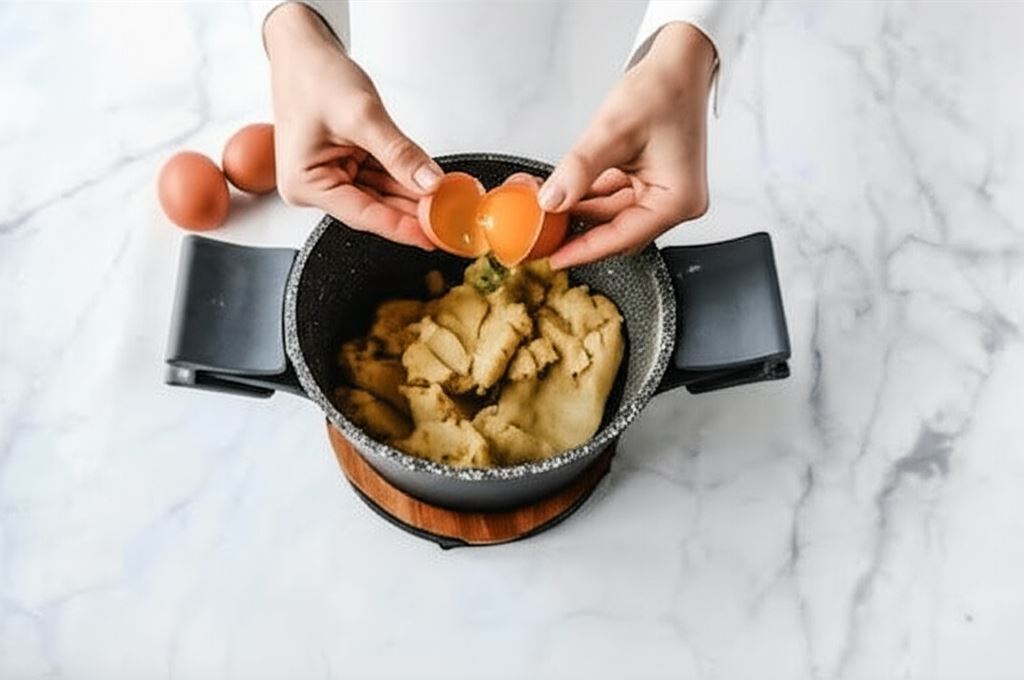 Do wystudzonej masy jajecznej wsyp kurze jaja i zblenduj na jednolitą masę. Tak przygotowane ciasto jest gotowe do smażenia.