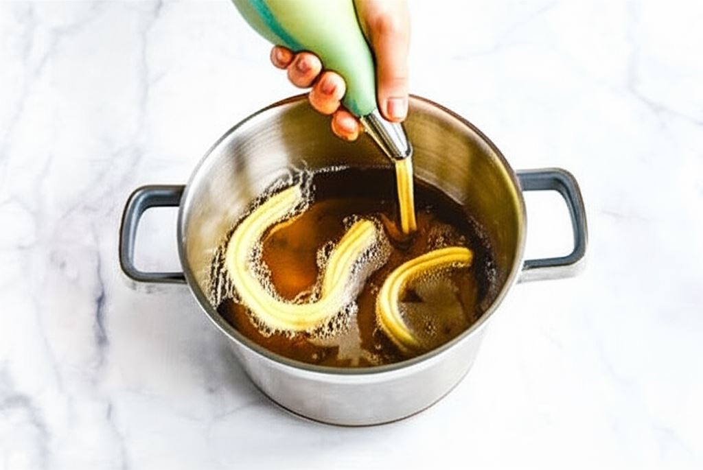 Wlej olej do głębokiej patelni lub szerokiego garnka i porządnie rozgrzej tłuszcz. Potem używając rękawa cukierniczego wyciskaj churros wprost na olej i smaż w głębokim tłuszczu, dopóki hiszpańskie ciasteczka z obu stron pięknie się zarumienią. Powtarzaj tę czynność aż do wyczerpania ciasta. Usmażone churros wyciągaj z oleju przy pomocy łyżki cedzakowej z otworami i przenoś na talerz pokryty warstwą ręcznika papierowego, który pochłonie nadmiar tłuszczu.