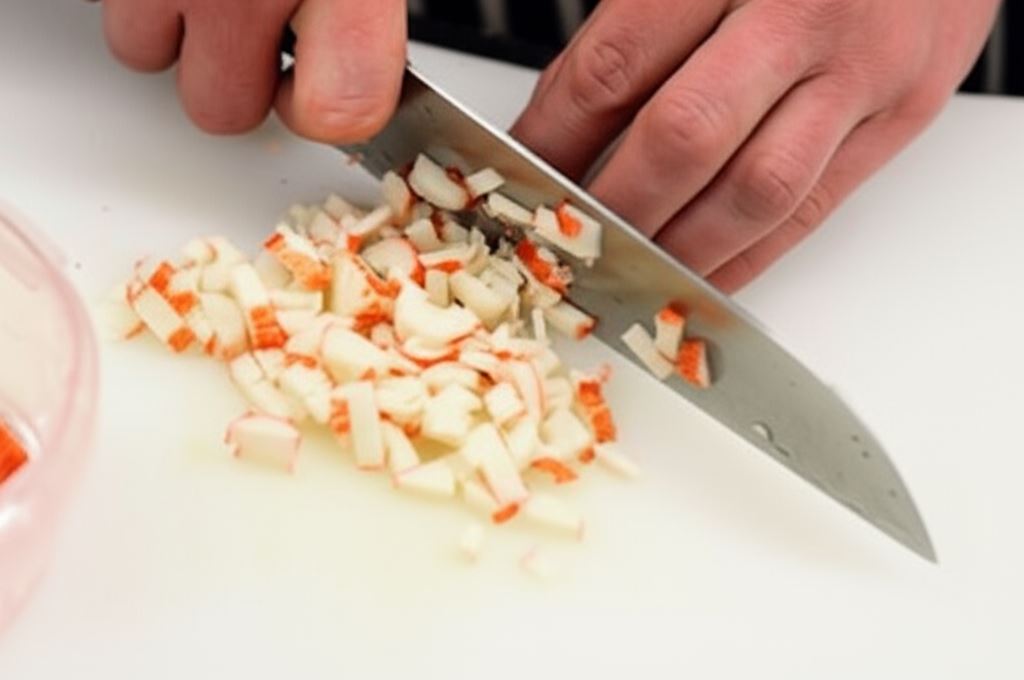 Mięso krabowe odciśnij. Jeżeli stosujesz paluszki krabowe, pokrój je na drobno. Umieść w misce.