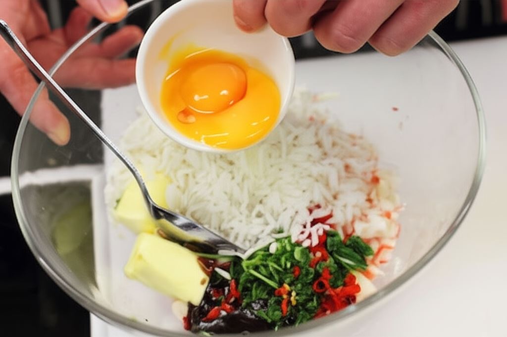 Wrzuć miękkie masło, sos ostrygowy, posiekane chilli, posiekaną kolendrę, żółtka i ryż.