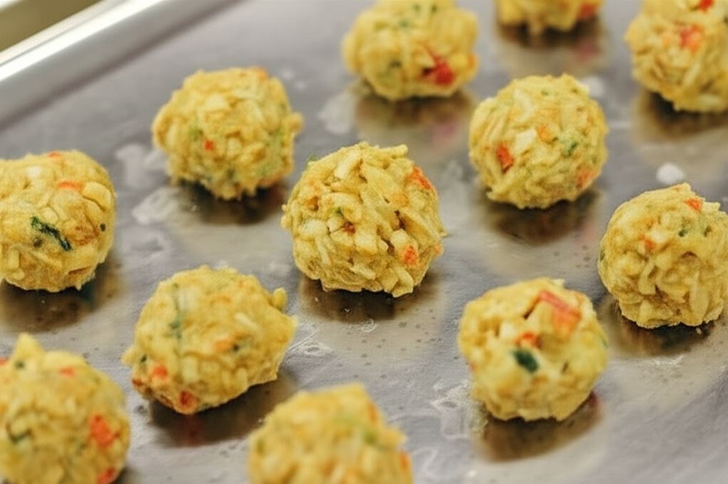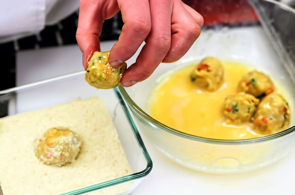 Obtocz kulki w rozbitym jajku i bułce tartej, następnie smaż w głębokim oleju. Pamiętaj, aby po usmażeniu osączyć kulki na papierowym ręczniku z nadmiaru tłuszczu.