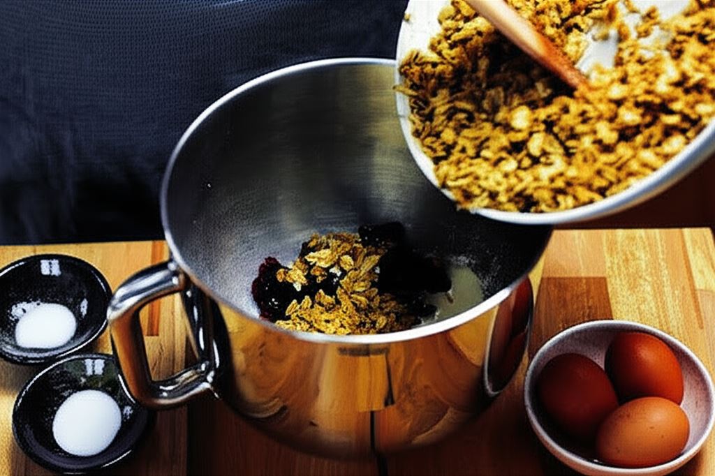 Do miski robota kuchennego wsyp przesianą mąkę, proszek do pieczenia, cukier wanilinowy, jajka, żurawinę i podprażone płatki. Wymieszaj przy użyciu haka.