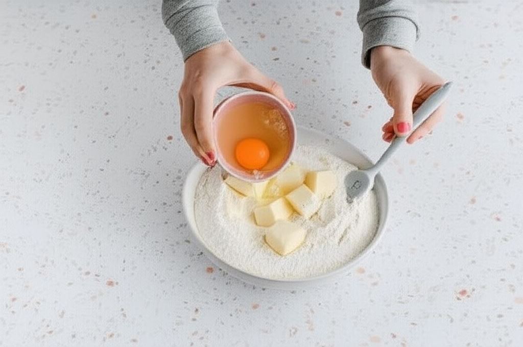 Mąkę przesypujemy do miski. Wsypujemy proszek do pieczenia, cukier puder i cukier waniliowy. Potem dodajemy masło pokrojone w kostkę oraz wbijamy jedno jajko. Całość wyrabiamy na gładkie ciasto.