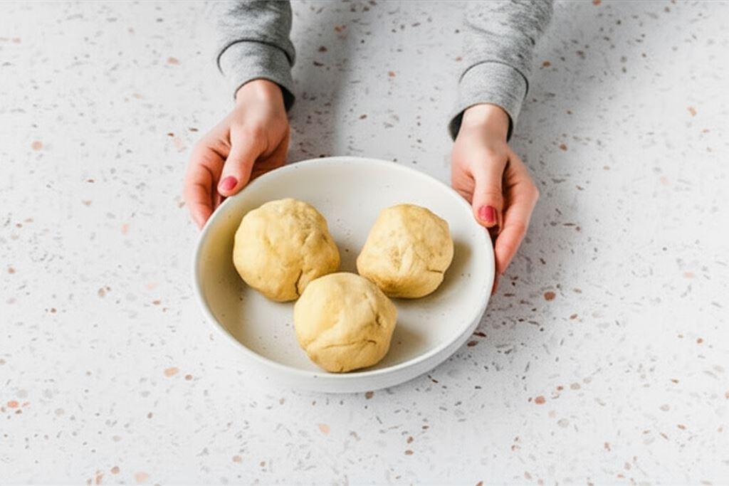 Dzielimy ciasto na trzy kule. Okrywamy folią i odstawiamy do lodówki na 30 min.