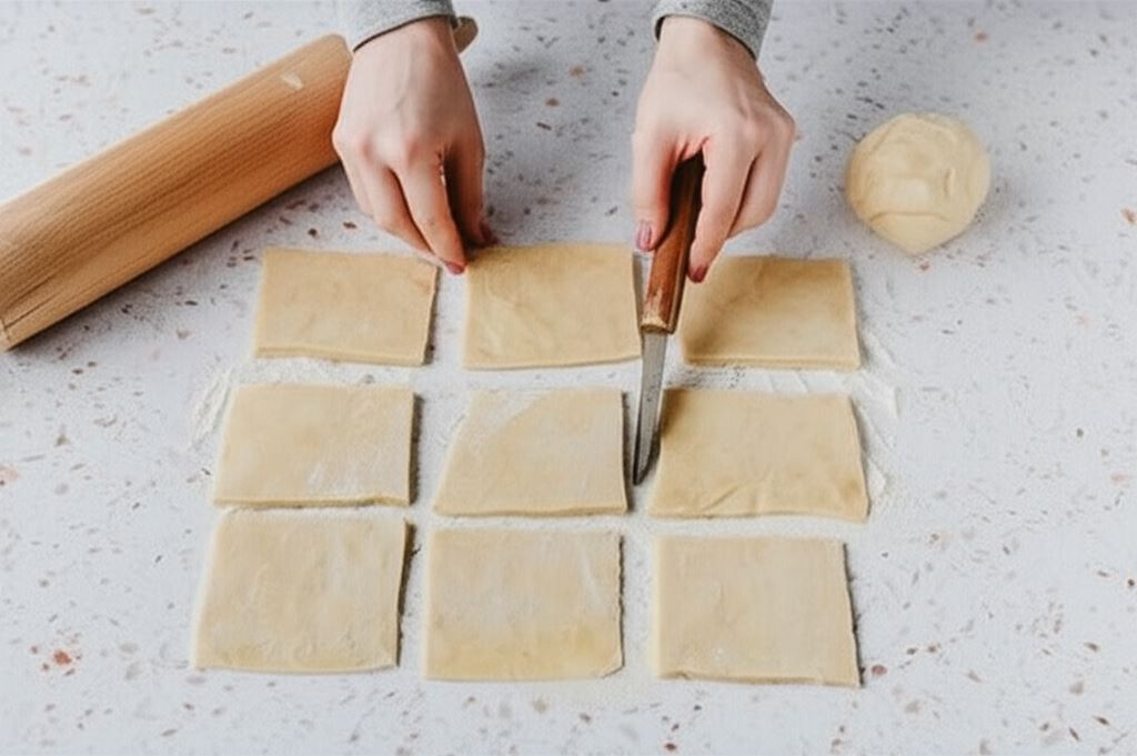 Każdą kulę rozwałkować i pokroić na kwadraty o wymiarach około 7 cm.
