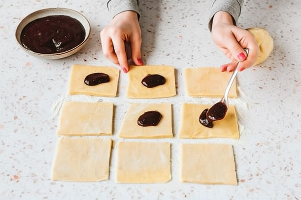 Na każdy kwadracik kładziemy łyżeczkę powideł śliwkowych.