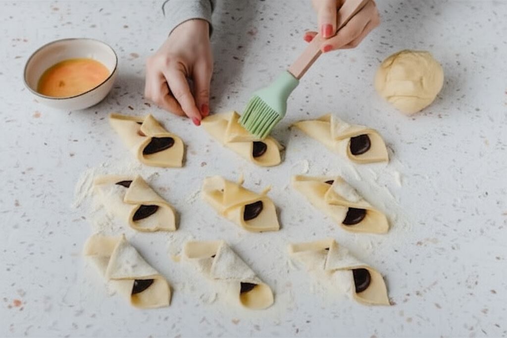 Jeden z rogów smarujemy roztrzepotanym jajkiem, by się lepiej sklejało. Sklejamy ciastka w formę rożka. Każde ciastko pokrywamy roztrzepotanym jajkiem. Umieszczamy je na blasze wyłożonej papierem do pieczenia i wypiekamy w piekarniku rozgrzanym do 190 C około 13-14 min aż się zarumienią.