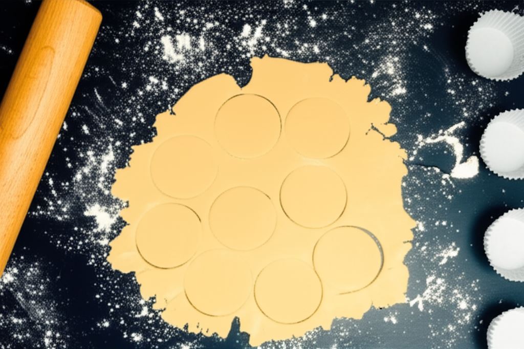 Ciasto wałkujemy z niewielką ilością mąki. Wycinamy okręgi jedne większe, drugie mniejsze.