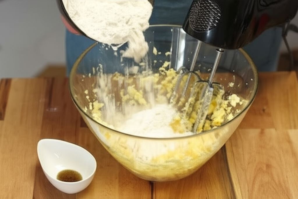 Potem wsyp obydwie mąki, cukier puder, ekstrakt wanilinowy i wymieszaj mikserem na niskich obrotach.